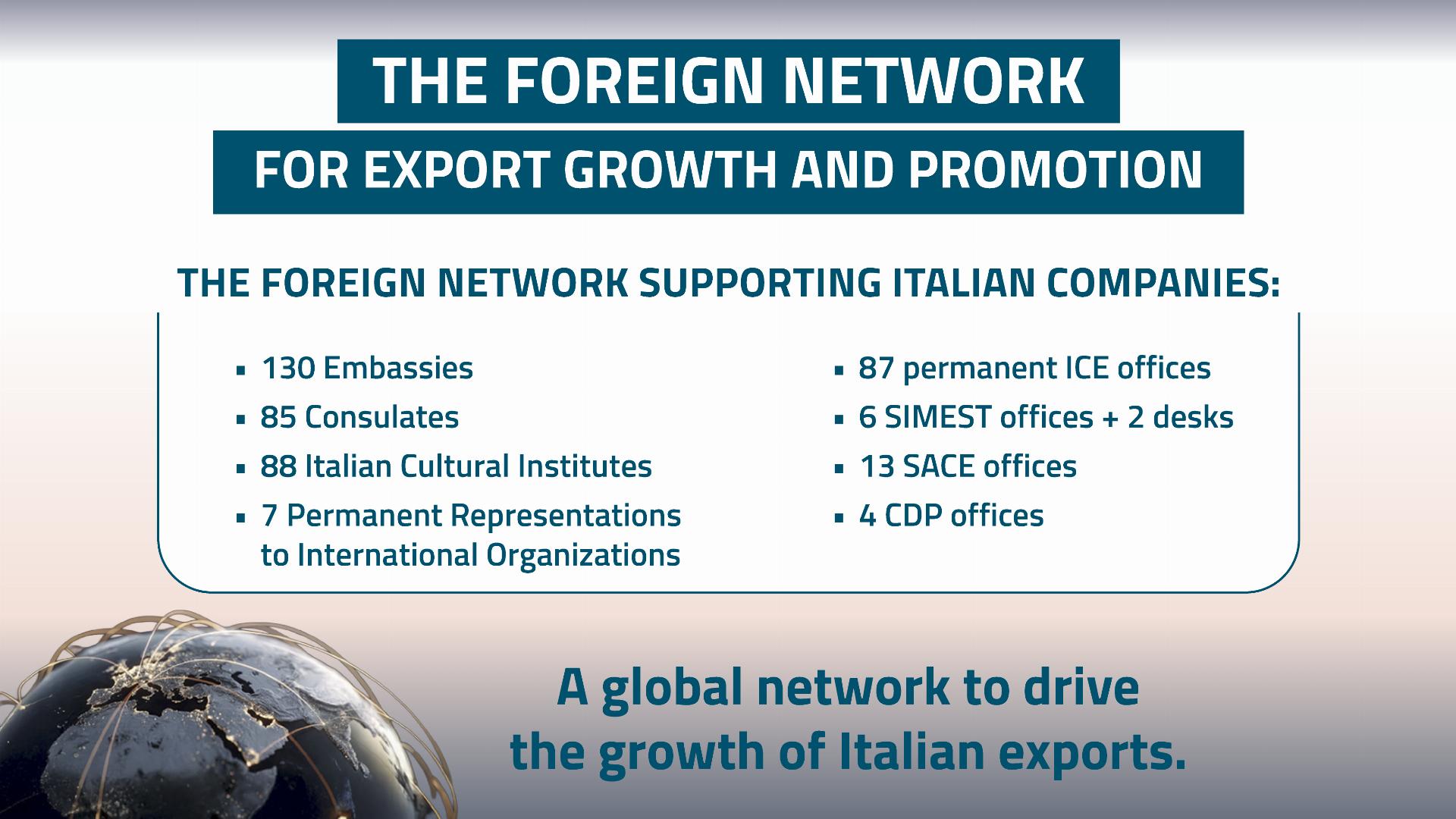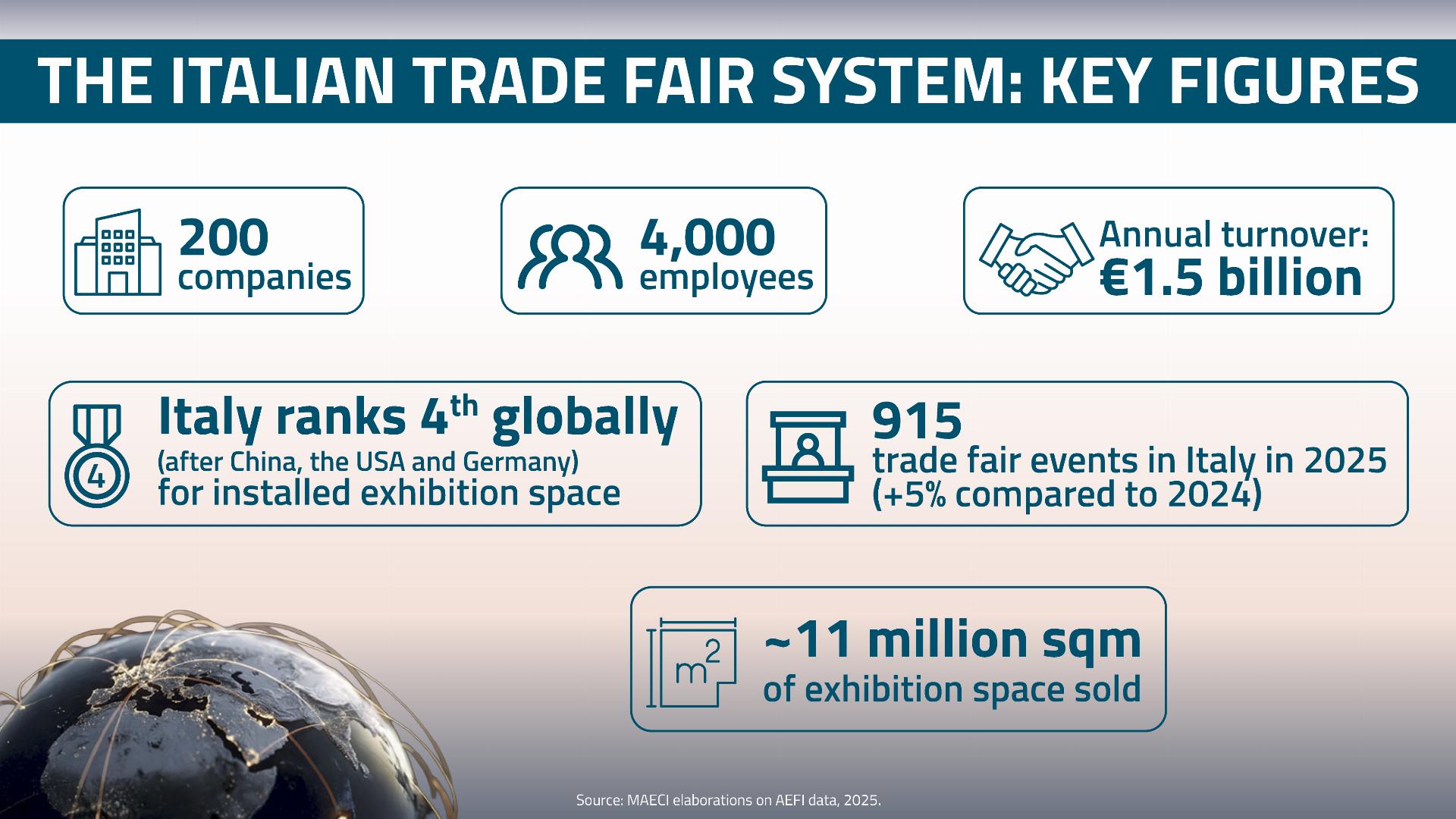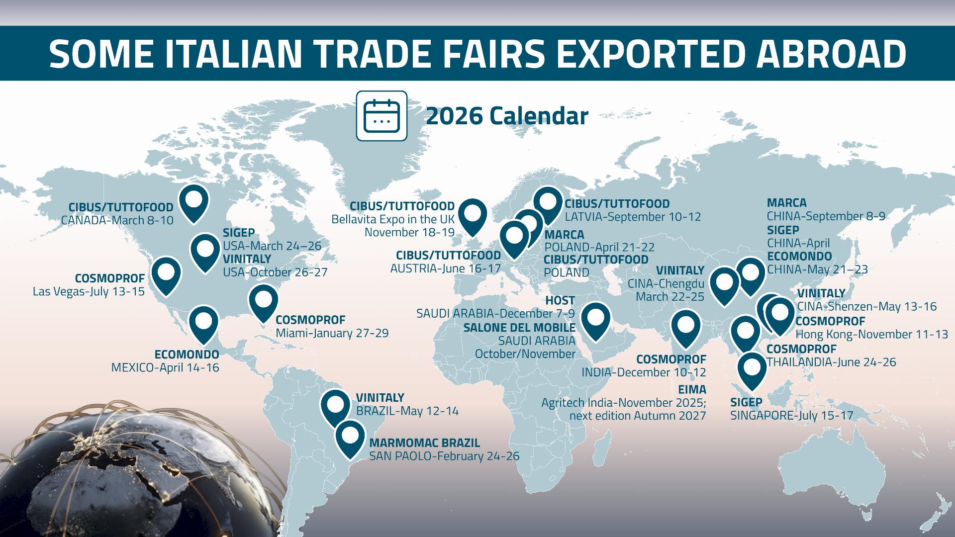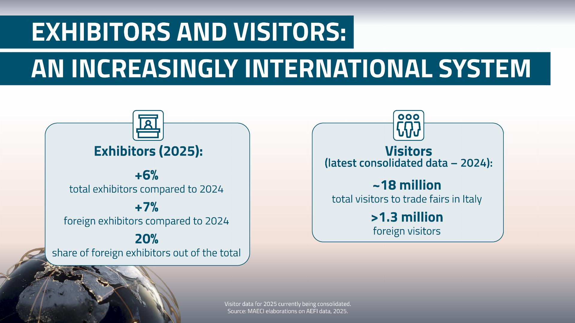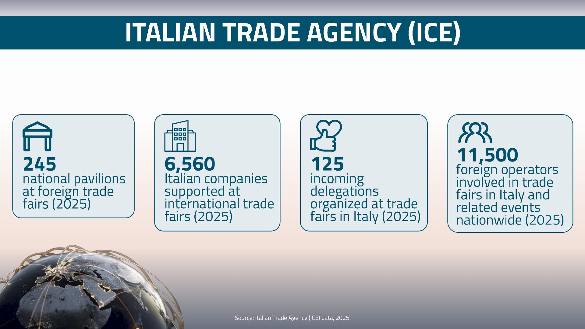 Az olasz Külügyi és Nemzetközi Együttműködési Minisztérium operatív szerveként működő ICE Ügynökség központi szerepet tölt be az export vásárokon keresztüli támogatásában. Ennek kapcsán 2025-ben több mint 200 millió eurót különítettek el az olasz KKV-k nemzetköziesítési programjára, különös tekintettel a vállalatok külföldi eseményeken való részvételének támogatására (90 millió euró), valamint azokra a kezdeményezésekre, amelyek célja nemzetközi szereplők bevonzása az olaszországi vásárokra (35 millió euró).